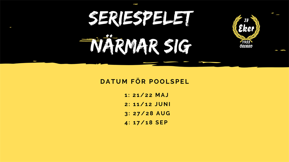 Hej, När det gäller seriespelet så spelas det i form av poolspel vid 4 st tillfällen. Vid varje tillfälle träffas 3-5 lag för att spela mot varandra. Datum för poolspel för pojkar 8 år: 1: 21/22 maj 2: 11/12 juni 3: 27/28 aug 4: 17/18 sep Man spelar antingen lördag eller söndag (ej båda dagarna). Vårt lag spelar två matcher vid varje tillfälle. Vi kommer troligtvis att få arrangera poolspelet vid ett av dessa tillfällen och kan anordna kiosk för att dra in pengar till lagkassan. Så nu vet ni vilka andra helger ni kan planera annat :-) Heja Eker!
