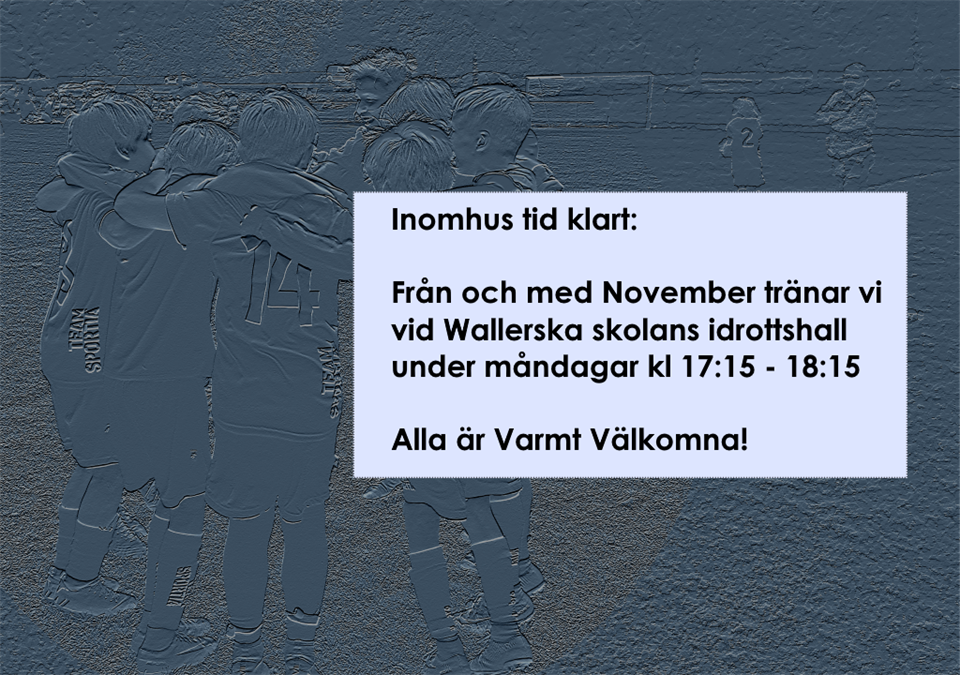 Hej, Tiden går fort när man har roligt. Oktober månad är ju snart här och vi fortsätter att träna utomhus onsdagar kl. 17 så länge vädret och gräsplanen tillåter. Kan man inte onsdagar så är man välkommen att träna med flickorna fredagar kl 17. Vi meddelar när vi ställer in. Från och med november månad flyttar vi inomhus och kommer att träna måndagar kl. 17:15 - 18:15 vid Wallerska skolans idrottshall. Vi har anpassat tiden så att ni föräldrar får lite mer tid på väg hem från arbetet. Första passet, den 2:a november, blir det en stor Labyrint bana eftersom vi har tillgång till alla redskap. Välkomna :-) Pst. Idag måndag kör vi sista lekfulla teknikträningen på konstgräset. Kalendern är alltid uppdaterad. Vi ses, Tränarna P-2014/2015 28 sep 2020 0kommentarer
