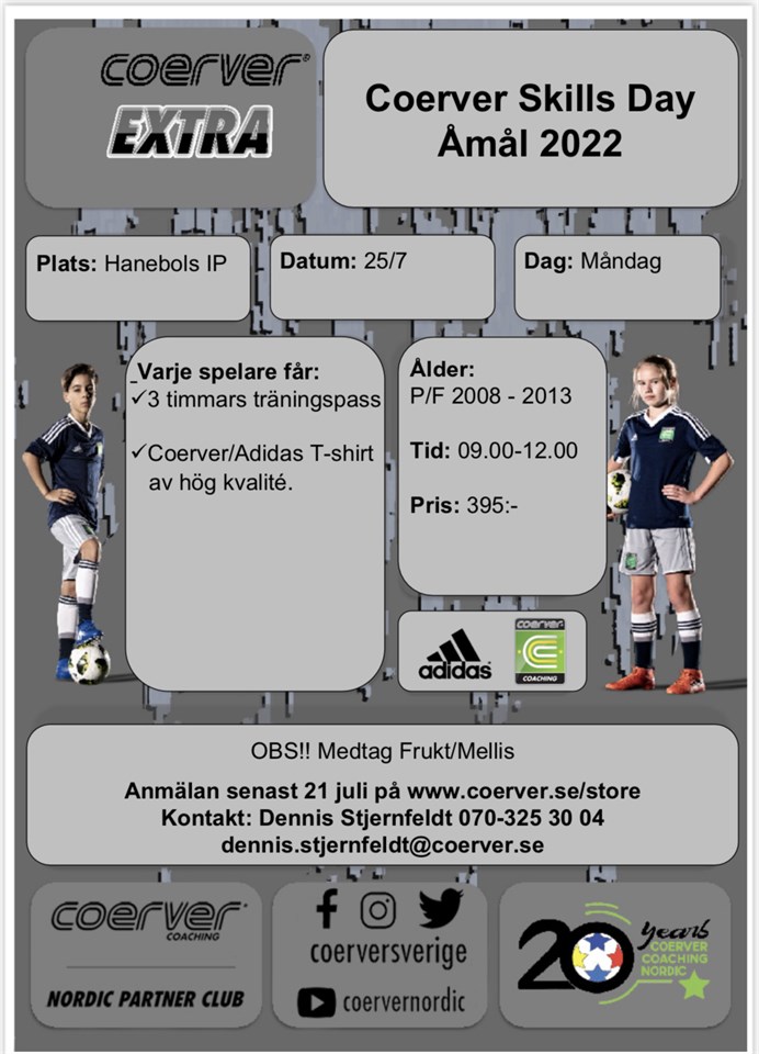 Den 25 Juli är Coerver Coaching i Åmål, på Handbols IP. De kör ett 3h teknikpass för ungdomar födda 2008-2013. Kostar 395 kr/deltagare. För er som är intresserade, anmäl er via länken nedan. https://coerver.se/product/coerver-skillsday-amal
