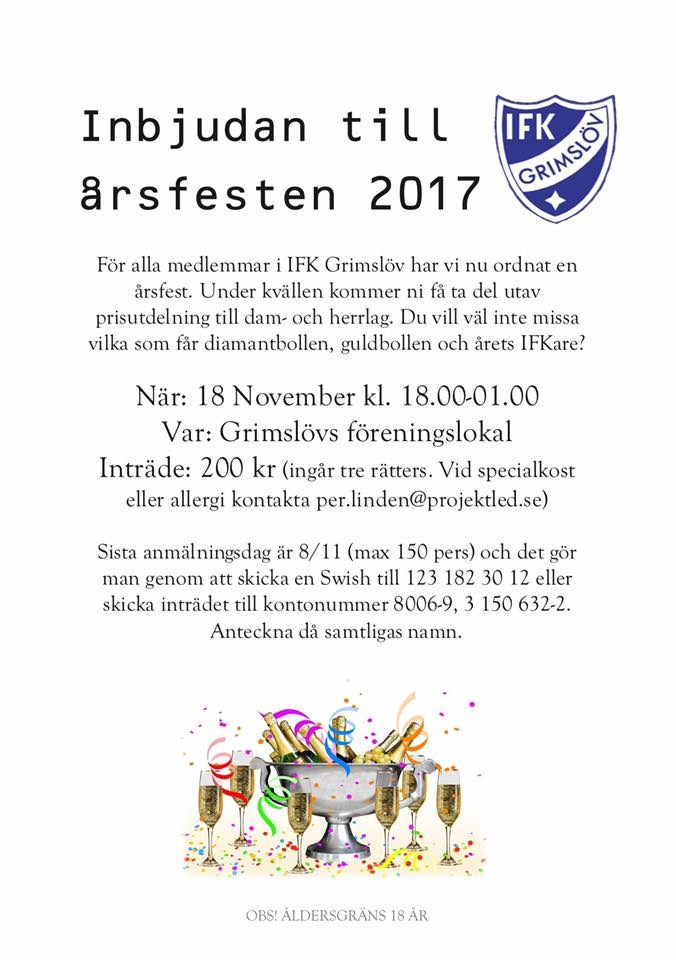 Hej. Lördagen den 18 november återuppstår en tradition då föreningen kommer ordna Årsfest i Föreningslokalen. Det blir som förr i tiden lite prisutdelningar, 3 rätters meny samt dans. Vore kul om vi kan bli ett gäng tillsammans från P 03 laget som vill festa loss och ha kul en kväll. Inbetalning sker via Swich eller direkt till kontonummer enligt inbjudan ovan. J-18 23 okt 2017 0kommentarer