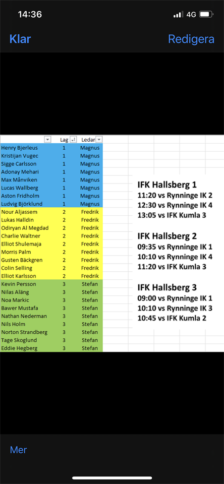 Hej. Lite info har gått ut inför helgen. Vi samlas i Hallsberg för ombyte och sedan åker vi till Rynninge. Jag bifogar en bild, kolla noga vilket barn som tillhör vilket lag då det är olika samlingstider. Samling: IFK HALLSBERG LAG 1 kl 9.30 IFK HALLSBERG LAG 2 kl 7.30 IFK HALLSBERG LAG 3 kl 7.30 Samåk gärna, det är ont om parkering på plats då örebrocupen spelas. Medtag matsäck eller mellis. Vatten, benskydd, grässkor är givet. Hör av er om ni har frågor! P-14 15 jun 2023 0kommentarer