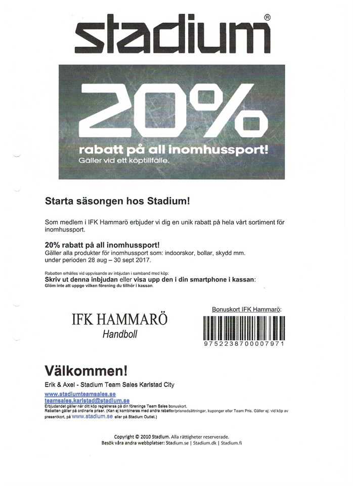 Hej på Er! Äntligen är höstens rabatt för inköp av inomhusprodukter på Stadium på gång. Rabatten gäller 28/8-30/9 Skriv ut och ta med, gäller i båda butikerna. Finns även att hämta i pappersform, på kansliet. Hälsningar Helle Johansson Kansliet F-05/06 24 aug 2017 1kommentar