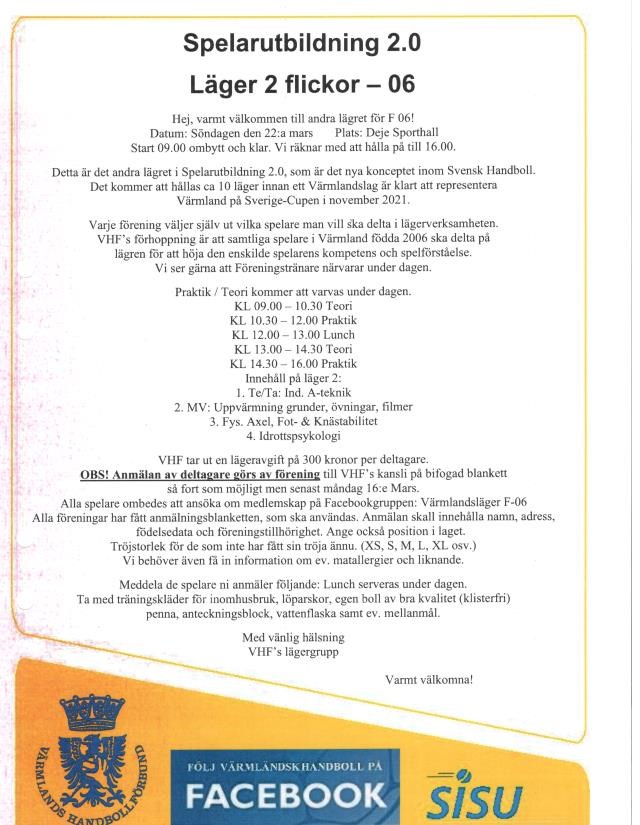 Hej. Här kommer inbjudan till Läger 2 flickor – 06 Datum: Söndagen den 22:a mars Plats: Deje Sporthall Start 09.00 ombytt och klar. Vi räknar med att hålla på till 16.00. OBS! Anmälan av deltagare görs av föreningen till VHF’s kansli så fort som möjligt men senast måndag 16:e Mars. Alla spelare ombedes att ansöka om medlemskap på Facebookgruppen: Värmlandsläger F-06. Denna Facebook grupp kommer att användas som informationskanal gentemot spelare, föräldrar samt föreningsledare. Vi skickar bla. ut spelarenkäter efter varje läger genom denna grupp. Mvh: Jukka-Pekka Laine kanslist VHF Anmäl nedan. Jag behöver bara anmälan, Ej alla uppgifter hädanefter :) Hälsningar Helle