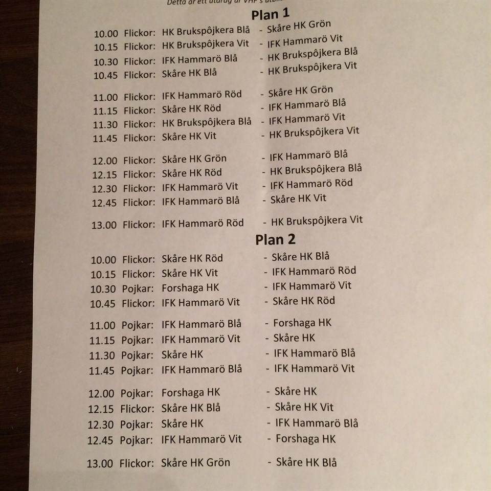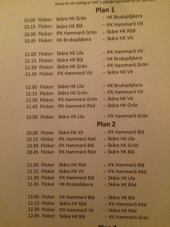 Hej, På söndag är det matchsammandrag i Gjutarens Sporthall i Karlstad (ligger bakom Nöjesfabriken). Vi samlas kl. 09.15 i Gjutaren. För att det skall bli mycket speltid för tjejerna kommer vi att ha 4 st lag. Vi kommer att spela på två planer och vi kommer att spela samtidigt vid sju tillfällen och därför kommer jag att behöva mycket hjälp av er föräldrar, hoppas att det finns många som kan hjälpa till och coacha tjejerna. Det man behöver tänka på är att hålla lite koll på byten, så att alla får spela ungefär lika mycket. Kommentera i fältet nedan om ni kan hjälpa till, så jag ser att vi löser detta tillsammans. Min tanke är att jag är på plan 2 hela tiden och när vi spelar samtidigt på plan 1 behöver jag hjälp där. Se bifogat spelschema. Lag grön Annie F Vera G Tova J Tindra M Moa W Lag vit Ebba K Olivia J Stina W Alma K Sara G Vilma L Lag Blå Elin S Frida T Elin D Sanna D Wilma M Clara F Lag röd Ida F Alva Bo Lisa B Lina T Ellen W Alva Be Sista matchen spelas kl. 13.00, jag vet att 3 st behöver gå lite tidigare för att vara med på en annan aktivitet. Mvh Christofer
