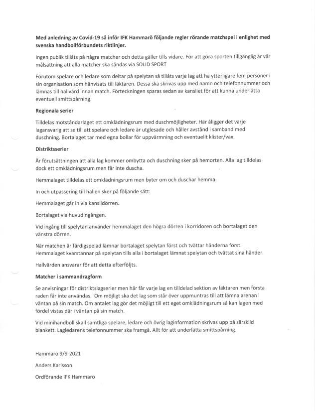 Hej på Er! Fr.om idag 9 september gäller följande regler vid matcher i Hammarlunden. Detta är tills vidare eller när ny information kommer! Var rädda om Er! P04/05 (P16/15) 10 sep 2020 0kommentarer