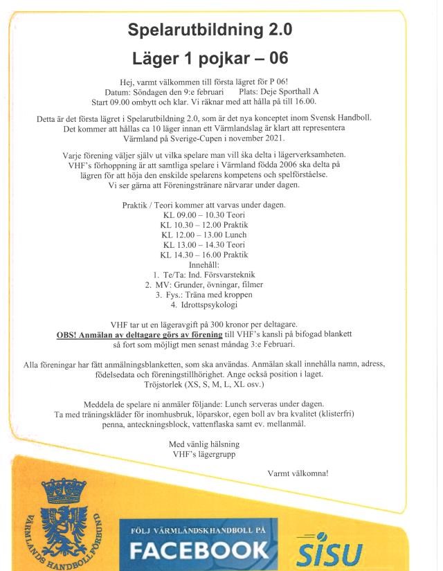 Välkommen till första lägret för Pojkar födda 2006 Jocke Bill! Datum: Söndagen den 9 februari Plats: Deje Sporthall B Start: 09.00 ombytt och klar. Vi räknar med att hålla på till 16.00. Detta är det första lägret i Spelarutbildning 2.0, som är det nya konceptet inom Svensk Handboll. Det kommer att hållas ca 10 läger innan ett Värmlandslag är klart att representera Värmland på Sverige-Cupen i november 2021. Läs igenom hela inbjudan, och anmäl sedan i kommentar nedan så fixar jag resten. Absolut sista anmälan måndag 3 februari! OBS! Klubben står inte för lägerkostnaden Glöm inte att skriva allt som efterfrågas i anmälan, inkl. mobil (förälder) Vid frågor kontakta via mail eller mobil Handbollshälsningar Helle Johansson Kanslist info@ifkhammaro.nu 076-7075014 P04/05 (P16/15) 13 jan 2020 2kommentarer