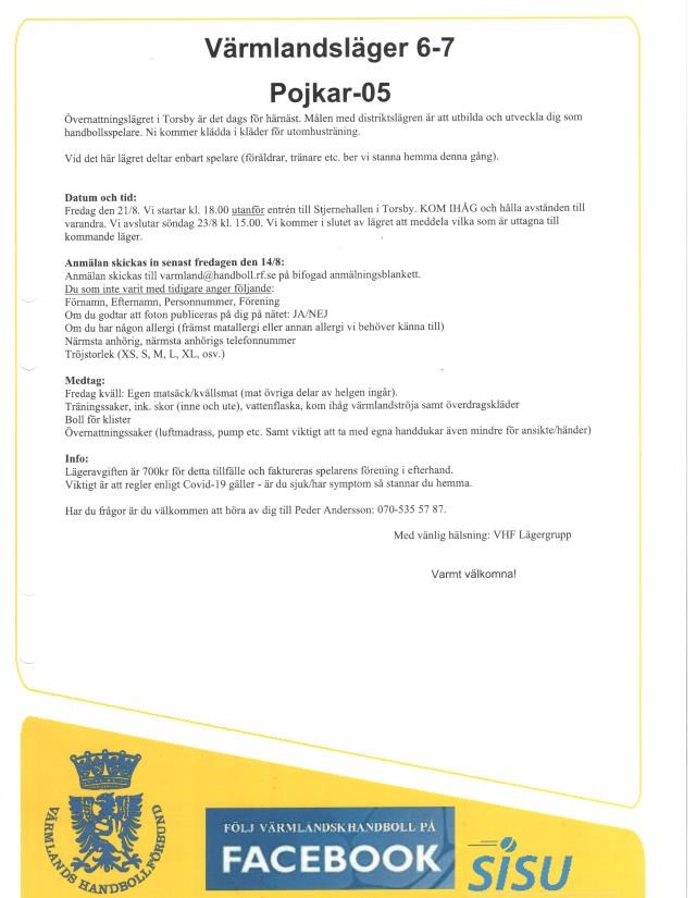 Inbjudan P05-läger 6 & 7 i Torsby 21-23 Augusti-20