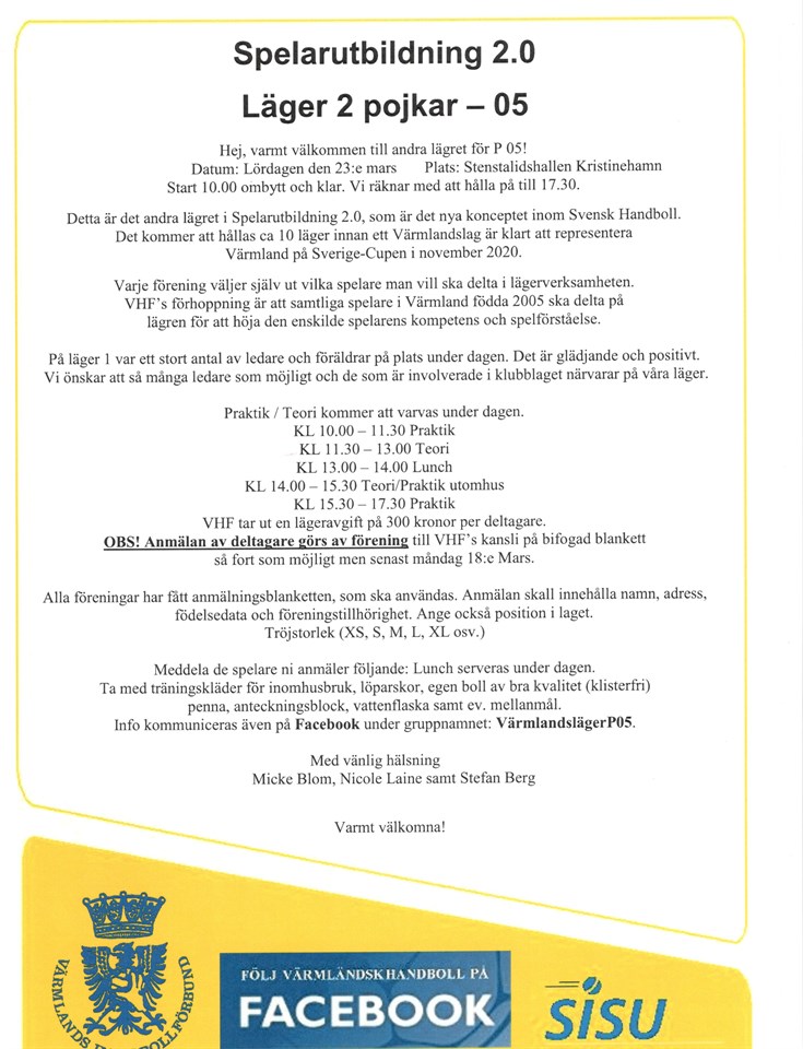 Hej. Här kommer inbjudan/anmälningsblankett till Värmlandsläger 2 för pojkar födda 2005. Datum: 23/3 Plats: Stenstalidshallen Kristinehamn Sista anmälningsdag 18/3 Amälan i kommentarsfältet nedan P04/05 (P16/15) 6 mar 2019 3kommentarer