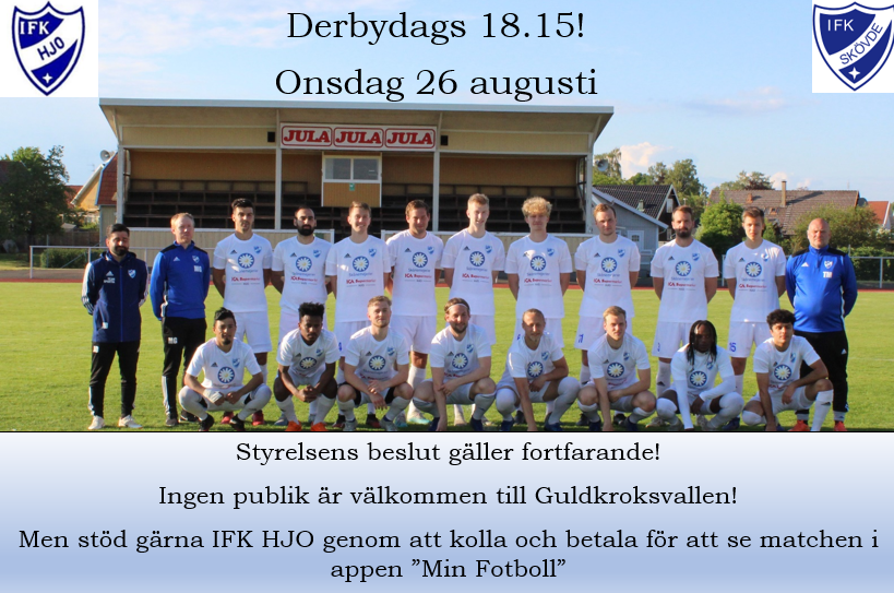 Derbydags på hemmaplan. Som tidigare matcher kommer IFK Hjo inte att ta in någon publik men matchen kommer att livesändas på ”min fotboll”. Detta beslut som styrelsen har tagit kommer att gälla tills nya beslut och direktiv kommer. Nedan har Elvis delgett sina tankar inför morgondagen. Kamratmöte igen denna gången mot seriefavoriten IFK Skövde. IFK Hjo tar emot Skövde på Guldkroksvallen imorgon 26 augusti i en spännande match där båda har inledd starkt med 3 vinster och en oavgjord och står därmed på 10 poäng vardera. Lagen möttes två gånger förra året i Div.4 och där avgick Hjo med vinst i bägge matcherna men det senaste mötet mellan lagen är IFK Skövdes sista förlust i seriesystemet, så det är ett stabilt lag som gästar oss. Med tanke på detta och att det är derby, är detta matchen alla har gått och väntat på och spelare som ledare är taggade och kommer så förberedda de kan, speciellt med tanke på det hårda matchandet som båda lagen har haft i augusti. Våran chans till poäng är att spela som ett lag och kriga för varandra och lita på vårt eget spel precis som vi gjort tidigare matcher. Vi har många spelare som presterar just nu och det är svåra val för tränarna att ta ut truppen när alla presterar både på matcher och träningar. Jag kan lova att vi kommer ge järnet därute och försöka får så många poäng till Hjo som möjligt.