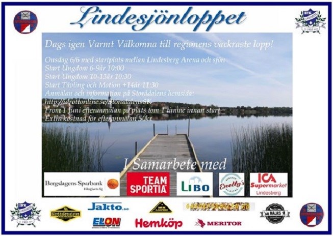 Välkommen till Lindesjönloppet Onsdagen den 6 Juni! Äntligen lite värme, nu är det hög tid att anmäla sig. Utmana släkt, vänner eller arbetskamrater att komma. Vi hoppas på stort intresse och som vanligt fin inramning. Vi hoppas även på mycket publik på tävlingsområdet och runt banan. Anmälan och detaljerad information finner du i länken anmälan nedan. Tävling och motion 9km, och även i år med barn och ungdomtkalsser 1 och 2 km. Mvh IFK Lindesberg och Storådalens SK Till Anmälan