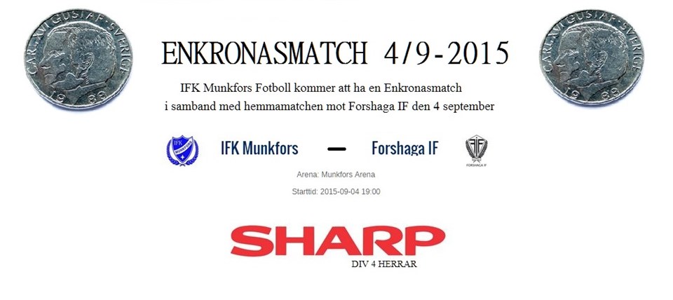 Då var det dags för årets "enkronasmatch" som kommer ske i samband med hemmamatchen mot Forshaga IF fredagen den 4 september ( Div 4 Herr, Sharpligan ). Bakom enkronasmatchen ligger IFK Munkfors Fotboll. Fredag 4/9 - 2015 , Match i Sharpligan´s Div 4 Herrar mellan IFK Munkfors - Forshaga IF Gratis Entré för ALLA , Speedshooting, Godisregn är något av det som sker under kvällen! Grillen är på denna afton där hambugare är ett alternativ . Kiosken är öppen där man kan inhandla kaffe , korv m bröd m.m Enkronasmatchen innebär att samtliga åskådare går in gratis, och istället får privatpersoner, föreningar, företag m.m möjligheten att sponsra med följande belopp : 1kr, 5kr, 10kr / åskådare (Ex. Väljer man att sponsra med 1 kr och det kommer 251 åskådare så betalar man som sponsor 251 kr. osv.) Man har även möjligheten att sponsra med valfritt fast belopp ( Ex. 350kr ) Vill du vara med och sponsra? Vill man agera sponsor och bidra till ett gynsammare föreningsliv så kan man kontakta följande - IFK Munkfors Kansli : Tele : 0563-521 17 eller mejl : kansli@ifkmunkfors.se ( Viktigt att ni uppger Namn, Adress samt belopp då allt faktureras efter avklarad match ) - Listor som man kan skriva på för sponsring finns på följande ställen i Munkfors : Frendo, OK/Q8 och Majas Gatukök. - Även samtliga spelare i A-laget ( Div 4 Herr Fotboll ) har en lista så det går givetvis bra att kontakta dessa om det känns som ett aternativ. Tack för din insats / IFK Munkfors Fotboll