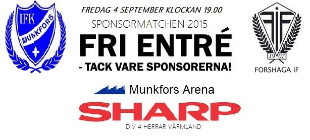 Fredagen den 4 september möts IFK Munkfors - Forshaga IF i ett stekhett fotbollsderby. Matchen är årets Sponsormatch2015 vilket betyder att det är Fri Entré där samtliga alltså går in gratis oavsett om man sponsrat eller inte. Avspark är klockan 19.00 Matchen - Derbyt Det kommer bli en tuff drabbning när Munkfors och Forshaga gör upp i den 18:e omgången av Sharpligan´s Div 4 Herrar. Fotbollsderbyt är i allra högsta grad en så kallad "sexpoängsmatch" där båda lagen kliver ut på konstgräsplanen vid Munkfors Arena med vetskapen om hur värdefull en seger i denna match är, och likaså betydelsen av den. För som tabellen ser ut nu, och med de kvarstående matcher som ska spelas kan skillanden mellan en vinst och förlust vara helt avgörande. - Både vi och Forshaga vet betydelsen av seger här, och vi har ingen annan ambition än att gå för 3poäng på fredag säger IFK Munkfors tränare Thomas Seth. - Vi har en klar Gameplan till derbyt mot FIF där alla lagdelar vet sina uppgifter. Så nu är det upp till grabbarna att fullfölja dessa och visa att vi vill spela i fyran nästa säsong. - Forshaga är ett bra lag som kanske ligger lite väl långt ner så vi förväntar oss en tät och tuff match. Seth vädjar avslutningsvis till alla att komma upp till matchen för att stötta IFK till seger och 3 poäng. Ett jämnt möte Statistiskt och historiskt sett har vi ett jämnt möte att vänta. Saker som talar för detta är att man i dom tre senaste inbördes möten vunnit varsinn match där en slutat oavgjort. Målskillnaden på dessa tre är lika jämn, nämligen 4-4. Resultaten i dessa tre senaste : 2015 , Forshaga IF - IFK Munkfors 0-2 , 2009 , Forshaga IF - IFK Munkfors 2-2 , IFK Munkfors - Forshaga IF 0-2 . Kan väl inte bli mycket jämnare än så?. Men vi avslutar med dagens tabellläge och matchens betydelse som kan tydas vara lika jämn för i den 12 lag starka serien kan man nästan inte skilja kvällens lag åt då Munkfors ligger 8:a med 21 poäng , precis ovanför 9:e placerade Forshaga IF med 18 poäng. Skillnaden är att IFK tagit en seger mer ,annars är det likaläge ( bortsett från målskillnaderna ). Jämnt alltså. Forshaga IF:s senaste match : FIF - Immetorp BK 2-2 IFK Munkfors senaste match : Strömtorp IK - IFK 2-1 (Lagens mesta målskyttar är gästernas Niklas Bengtsson med 10 mål där IFK:s bäste målskytt är Derrick Ssentongo med sina 7 mål) Vilka som är sponsorer hittar ni här : SPONSORER ( SPONSORMATCHEN 2015 ) Varmt välkomna till Munkfors Arena och en riktigt trevlig kväll i fotbollens tecken / Sundström