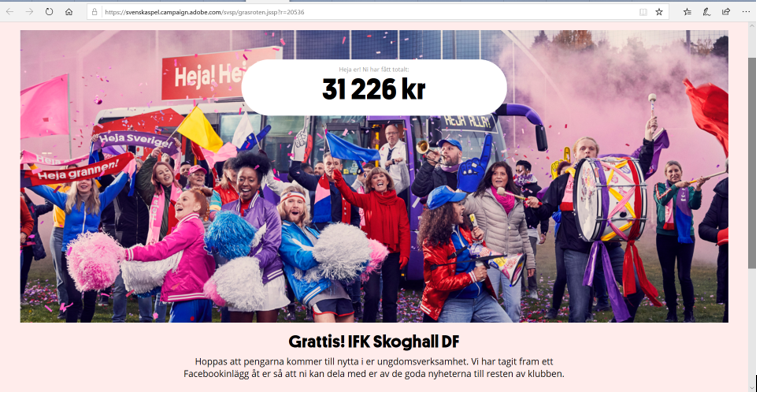 Vår klubb är en del av Svenska Spels initiativ Gräsroten som årligen delar ut 50 miljoner till ungdomsidrotten. För er som ännu inte är ansluta gå in på nedan länk och välj vår förening. Ni kan stötta upp till 3 föreningar samtidigt. IFK Skoghall DF-gräsroten Tusen Tack till alla som har valt att stötta vår förening genom att vara ansluten till Gräsroten Svenska Spel. Det gav föreningen 31 226.- i utdelning denna gång ! /Styrelsen