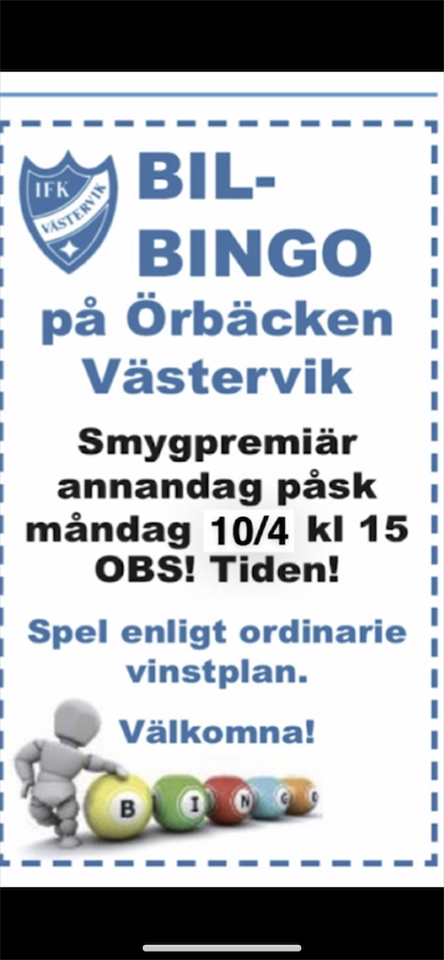 PÅSKBINGO!! Idag kör vi smygpremiär med BILBINGO PÅ ÖRBÄCKEN kl 15.00! Obs tiden! Det blir perfekt bingoväder och försäljningen av brickor startar kl 13.45 och samtidigt öppnar kiosken. Vi spelar efter ordinarie vinstplan.🐣💰?? Varmt välkomna till att knyta ihop påsken med en bilbingoeftermiddag på Örbäcken.🐣👍 https://www.laget.se/ifkvastervikbilbingo/News/7236582/ANNANDAG-PASK-bingo-mandag-10-4-kl-1500