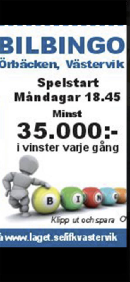 Nu är det nästa! Nästa måndag är det dags för sommarens bilbingopremiär på Örbäcken. Vi startar måndag 29/5 kl 18.45 och sen rullar det på varje måndag hela sommaren under juni, juli, augusti: 5/6, 12/6, 19/6, 26/6, 3/7, 10/7, 17/7, 24/7, 31/7, 7/8, 14/8, 21/8, 28/8.??Varmt välkomna till ännu en bilbingosommar på Örbäcken 🚗💰?