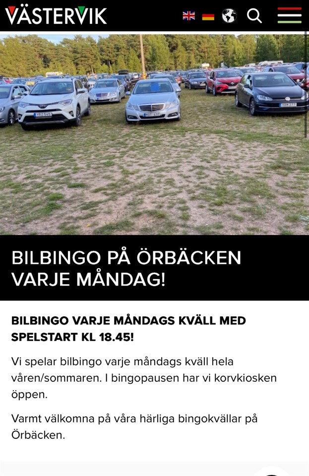 I måndags hade vi ännu en trevlig bingokväll på Örbäcken även om det just vid försäljningen kom ett åskoväder med skyfall. Resten av bingokvöllen blev som alltid trevlig och stort grattis till alla bingovinnare. Fr a allt till dig som vann kvällens högsta vinst 4000:- på 50/50 brickan och dig som vann 2500:- på freeplay brickan. Vi fortsätter med våra trevliga bingokvällar varje måndag hela sommaren fram till slutet av augusti. Nästa måndag 30/6 är jackpotten på freeplay brickan uppe på hela 15000:- vid bingo inom 56 drag. Så spännande! Spelstart är kl 18.45 och brickförsäljningen startar kl 17.30. I korvkiosken finns korv, kaffe mm. Varmt välkomna! 🚗💰 Bilbingo 25 jun 1kommentar