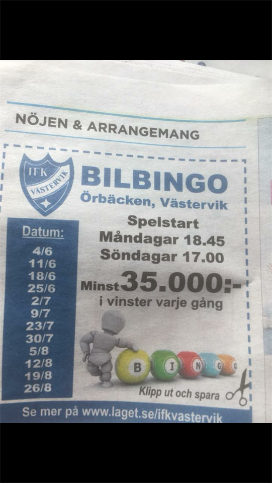 • Bilbingo ikväll måndag 9/7, välkomna!