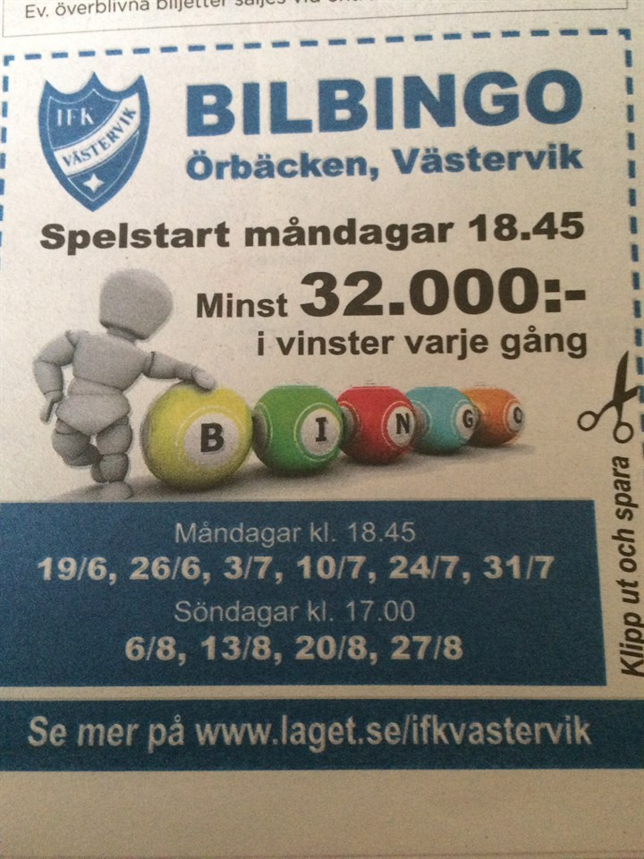 BILBINGO IMORGON SÖNDAG 6 AUGUSTI KL 17.00!! Observera dag och tid Jackpotten på 13000 kronor 💰💸😉 Imorgon SÖNDAG 6 AUGUSTI KL 17.00 spelar vi åter bilbingo på Örbäcken. I augusti är det söndagar med spelstart kl 17.00 som gäller. Freeplay-jackpotten är imorgon uppe i hela 13000 kronor om man får bingo inom 54 drag. Jackpotten har redan klarat sig ett steg längre än förra året då en vinnare vann 12000:- (rekord för IFKs bilbingo). Lyckas någon vinna 13000:- imorgon? Hinner ni inte till starten kl 17.00 är ni välkomna i pausen ca kl 18.30 då ni kan köpa brickor till spelen efter pausen: halva block 15:-, 50/50 brickor 20:- och freeplaybrickor 20:-. Som alltid är kiosken öppen och där går det köpa korv, kaffe mm. Väderprognosen ser ännu en gång perfekt ut för bilbingo så varmt välkomna både nya och gamla bingospelare 💰📡🚕? Bilbingo 5 aug 2017 0kommentarer
