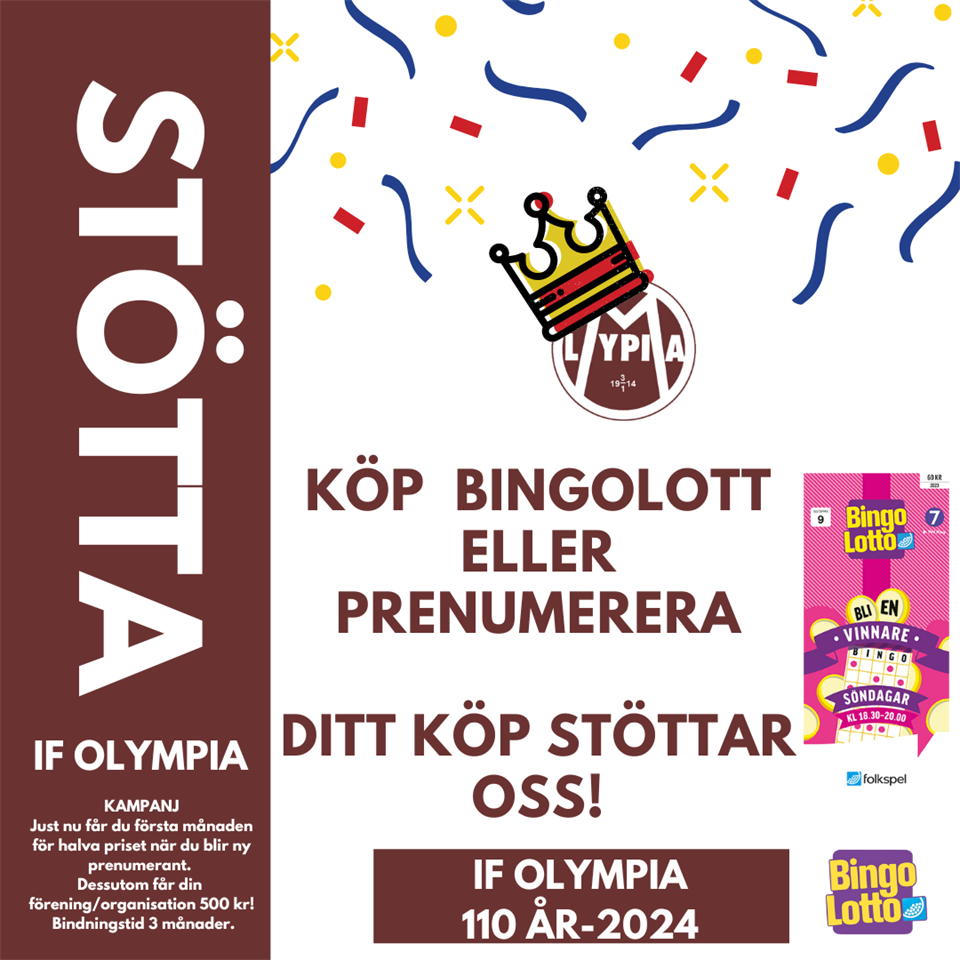 STÖTTA IF OLYMPIA KÖP SVERIGELOTT ELLER BINGOLOTT ELLER PRENUMERERA. FÖR VARJE NY PRENUMERANT FÅR IF OLYMPIA 500 KRONOR. DITT KÖP/PRENUMERATION STÖTTAR OSS! PRENUMERATION BRONSBINGO KAMPANJ Just nu får du första månaden för halva priset när du blir ny prenumerant. Dessutom får din förening/organisation 500 kr! Bindningstid 3 månader. KÖP BINGOLOTTER PRENUMERATION: SVERIGELOTTEN Kampanj Just nu får du första månaden för halva priset när du blir ny prenumerant. Dessutom får din förening/organisation 500 kr! Bindningstid 3 månader.