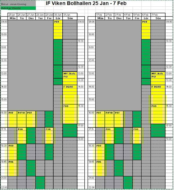 Bilden visar vilka Vikenlag som tränar när i Bollhallen 25 Jan - 7 Feb. Schemat finns även sparat under dokument.