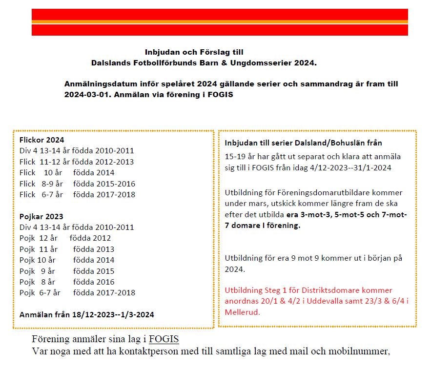 Hej, Senast 2024-03-01 ska våra lag vara anmälda till respektive serie. Detta görs av ledarna själva, men behöver ni hjälp med anmälan hör av er till Anders Klässbo. Minst en representant/lag bör åka på informationsmötet 5 Mars, se nedan. Barn o Ungdomsinfo (serieupplägg) 6-19 år möte 5 mars kl. 18.00 Tingshuset , Mellerud inleds med föreläsning av Stefan Olofsson på Temat Nivåanpassning, därefter spelforms mässiga grupper Anmälan https://dalsland.svenskfotboll.se/utbildning/