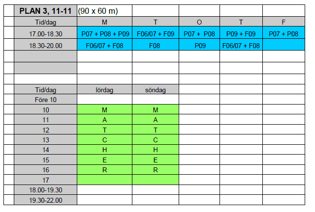 Bilden och pdf-schemat i dokumentmappen visar träningstiderna för plan 3 på Hanebol. Vi återkommer när tiderna börjar gälla. Det kommer troligtvis också att vara möjligt att träna och spela matcher på planen vid Karlberg. Vi väntar på besked från kommunen hur det blir med den saken. Får vi denna möjlighet så frigörs det mer alternativ om man vill träna på helplan. Hanebol, plan 3, kommer att slitas hårt med belastning enligt nuvarande schema med träningar och matcher på hela ytan alla dagar i veckan, vilket gör att vi kommer flytta några lag till Karlberg om denna möjlighet ges. Ungdomssektion 21 apr 2022 0kommentarer