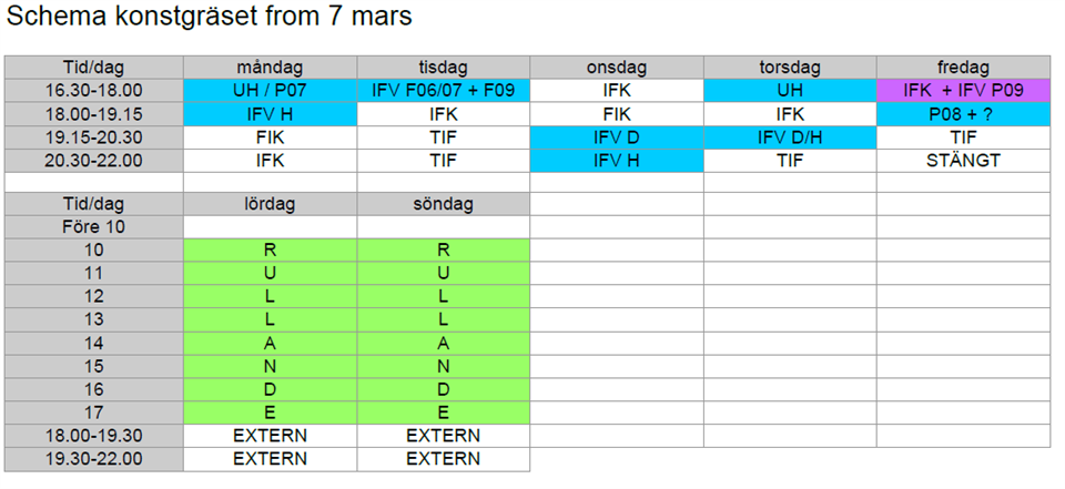 • Schema konstgräset from 7 mars