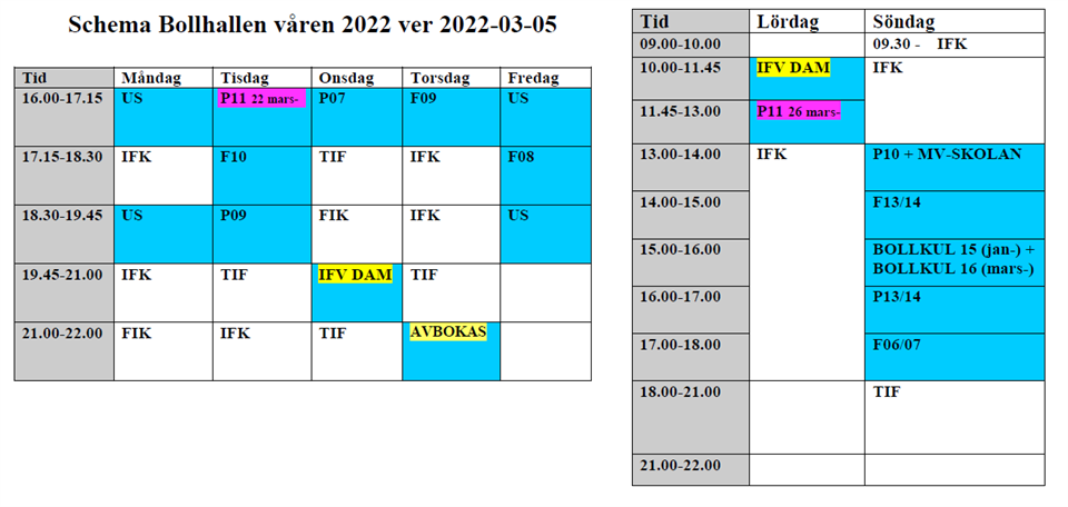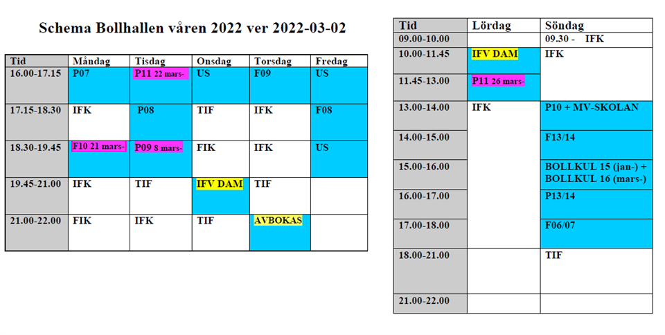• Schema Bollhallen from 7 mars - uppdatering