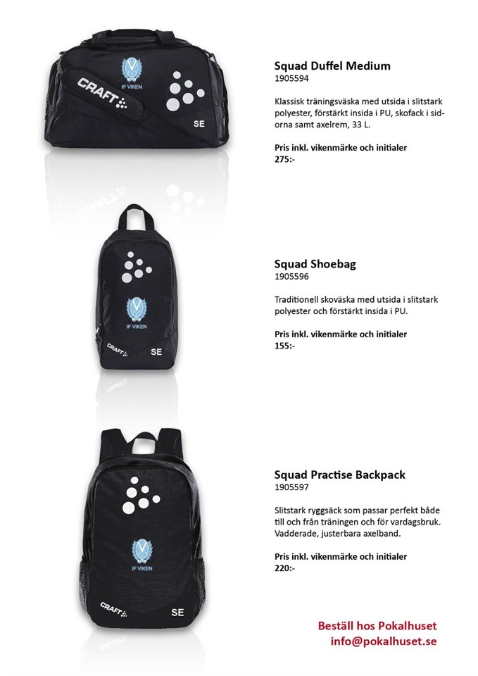 Hej! Julklappstips till alla Viken-tjejer och Viken-killar: Det var nu många år sedan det fanns möjlighet att kunna köpa en väska med Vikentryck, något som många efterfrågat. Nu finns möjlighet att beställa ryggsäck, bag eller skoväska med Vikentryck och initialer hos Pokalhuset till riktigt bra priser! Beställning, hämtning och betalning sker direkt via pokalhuset. Beställ via mail, hämta och betala på Industrigatan 20 i Åmål. OBS! Beställning är bindande eftersom man trycker ert barns initialer på! Info och priser finns om ni klickar på bilden ovan! Lägg gärna ut infon på era respektive laget-sidor Vänliga hälsningar u-sektionen