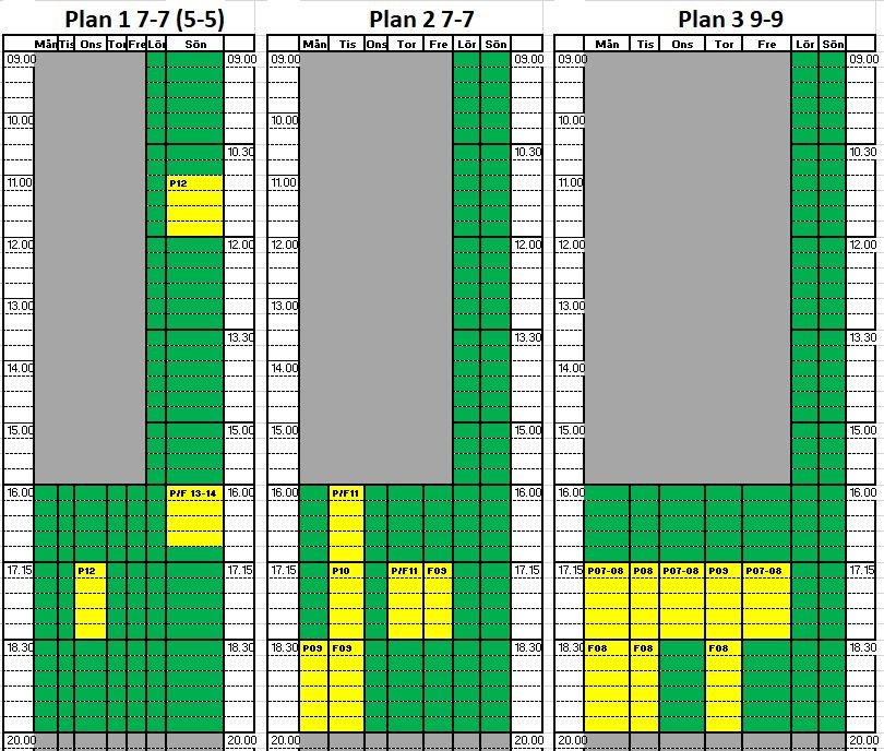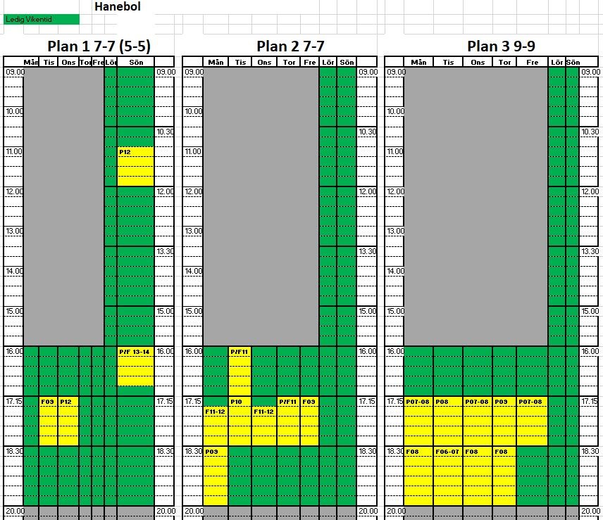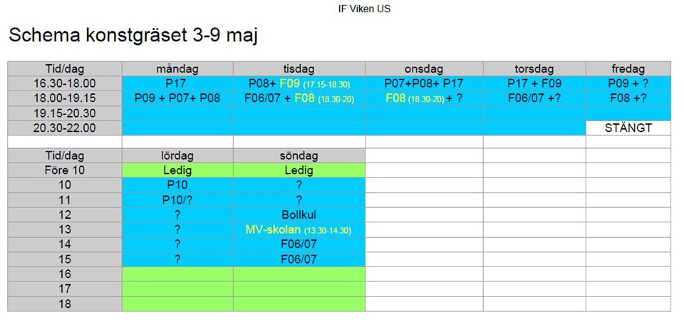 Detta utskick gäller planerna på Hanebol och Konstgräset from när gräsplanerna har öppnats av kommunen. För bokningar och ändringar av träningstider på Hanebol, kontakta Peter Thorpman. - En del lag har inte skickat in sina önskemål, följaktligen finns man då inte i schemat - Alla har inte fått exakt vad man önskat. Funkar inte den tid man fått, kontakta Peter, men kolla också själva innan om det finns något annat lag som ni kan byta tid med. - Vill man boka nån av de lediga tiderna, eller avboka en tid man fått, kontakta Peter. - Gällande helgtider har matcher förtur. Har man en helgtid får man räkna med att man måste ändra sin tid ibland för att lämna plats åt matcher För bokningar och ändringar av träningstider på Konstgräset, kontakta Magnus Sahlin. - I nuläget väldigt många tider lediga på Konstgräset, Magnus kommer med ett schema snart. Bifogat är schemat för Hanebol's planerna i nuläget. Kommer uppdateras och läggas bland dokument när ändringar sker. Hälsningar Ungdomssektionen