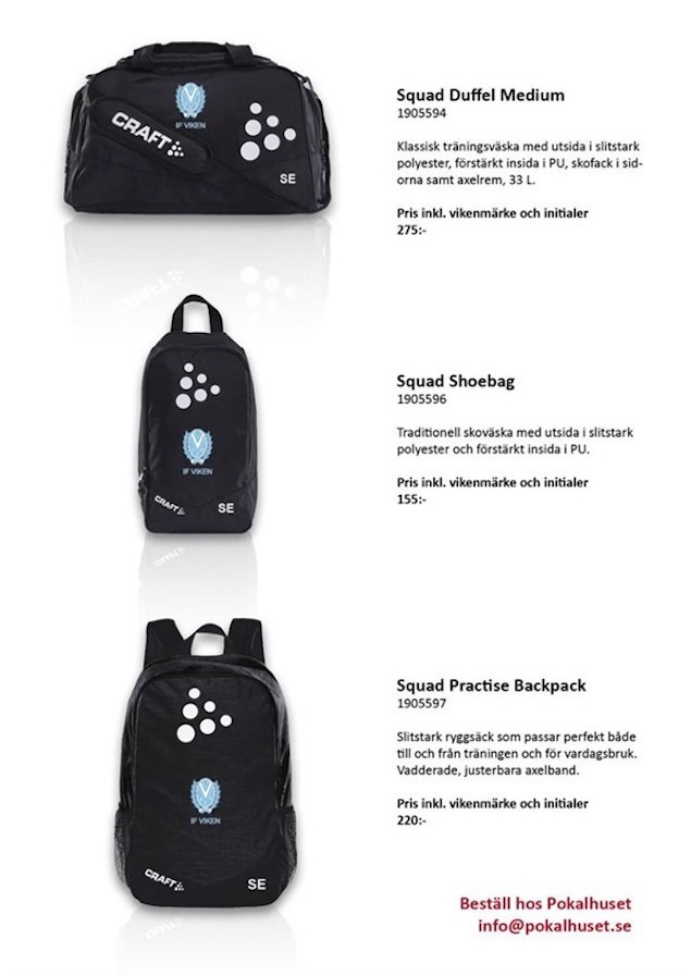 Nu finns möjlighet att beställa väskor med tryck (Vikenemblem samt initialer) till riktigt bra priser. Ryggsäck, sportbag eller skoväska finns. Beställning, hämtning och betalning sker direkt via Pokalhuset. Epost: info@pokalhuset.se, Adress: Industrigatan 20 Se bifogad bild för mer info! P-07 10 nov 2021 0kommentarer