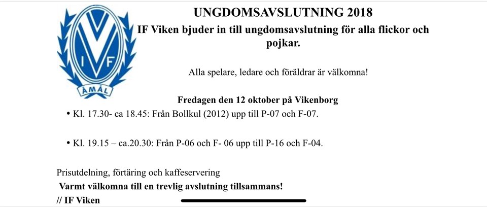 Hej! Då var det dags för fotbollsavslutning. Den är på Vikenborg nu på Fredag 12/10 kl 17.30 - ca 18.45. Prisutdelning, förtäring och kaffeservering. Alla spelare och föräldrar är varmt välkomna till en trevlig avslutning tillsammans! Hoppas vi ses! / Tränarna P-07 6 okt 2018 0kommentarer