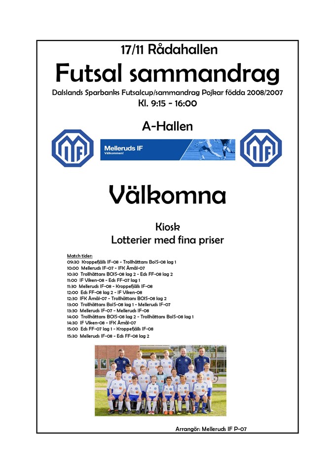 Nu på söndag, 17/11 är det dags för det första av fyra FUTSAL-sammandrag i Dalsland Sparbanks futsalcup.Efter fredagsträningen kommer vi att kalla max 11 spelare. Vi baserar urvalet på antalet futsalträningar nu i höst. Om man gjort minst två av fem träningar inomhus blir man kallad. Matcherna spelas i Rådahallen i Mellerud, spelschema enligt nedan. Glöm inte träningen i morgon. För er som spelar innebandy så ska vi vara tillbaka i tid för matchen mot Nordmarken. Juniorlag Herr 14 nov 2019 0kommentarer