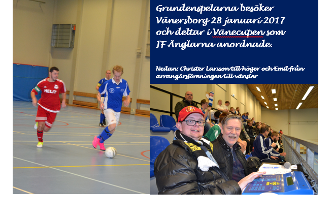 Fotbollsföreningen IF Änglarna, Vänersborg, arrangerade lördagen den 28 januari Vänecupen. Våra Grundenlag, Lag 1 och Lag 2, var med och spelade i denna futsal-cup som hölls i Vargön. Härlig spelarglädje och go kämparanda gjorde det till en lyckad dag. Bra jobbat, alla som deltog! Här kan ni se resultaten från Vänecupen 2017: Resultatlista_2017-01-28