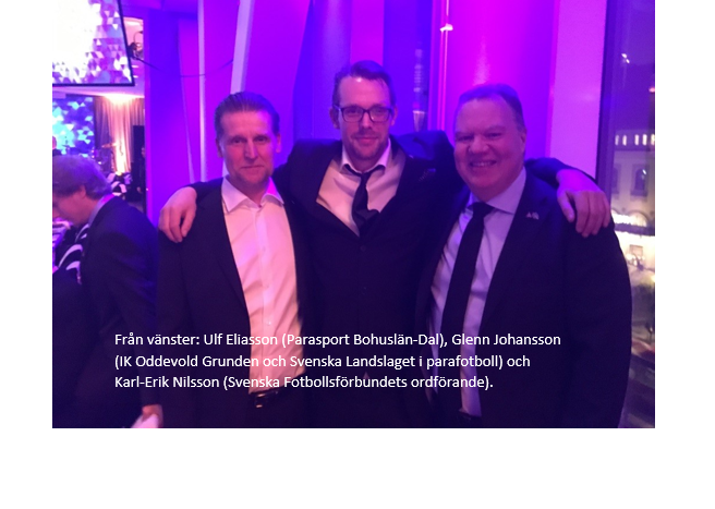 Svenska Parasportgalan 2017 Lördagen den 4 februari presenterade Scandic den första Svenska Parasportgalan någonsin. En kväll för att samlas och gemensamt visa vår uppskattning till de fina prestationer som aktiva och ledare har gjort under året 2016. Uddevalla representerades av vår Grundenmedlem Glenn Johansson, som även är med i Svenska Landslaget i parafotboll, samt Ulf Eliasson från Parasport Bohuslän-Dal och Karl-Erik Nilsson som är ordförande i Svenska Fotbollsförbundet.