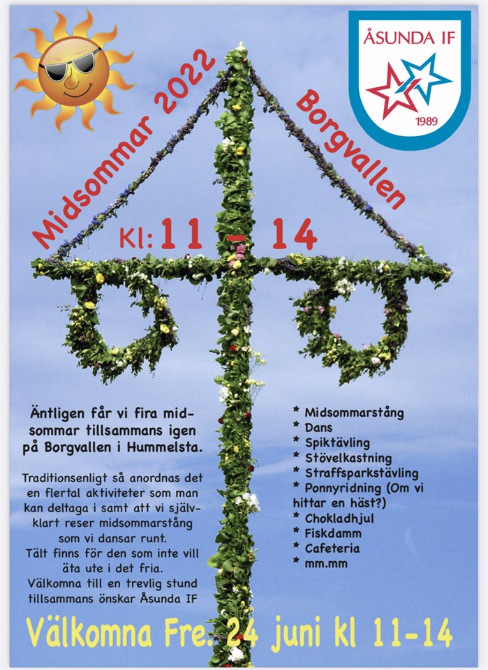 Väkomna att återigen fira Midsommar med oss i Åsunda IF på Borgvallen! Vi uppmanar alla att hjälpas åt att bidra med vinster till de olika tävlingarna. Kan vara både smått och stort. Lämnas till respektive ledare i god tid. Som exempel så har vi redan fått sponsrat från Hummelsta Pizzeria och Lifvs genom att bara fråga, så våga fråga det är många som vill vara med och sponsra. Vi kommer såklart under dagen att berätta vilka sponsorer vi har. Vi hoppas på många besökare och ett stort engagemang. Varmt välkomna! /Styrelsen Motion innebandy 2 jun 2022 0kommentarer