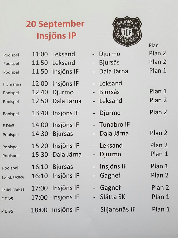 Blir en fotbollens dag på Insjöns IP. Alla lag inom sektionen kommer spela match mot inbjudna lag. Se till att få ner vänner & släktingar. Stötta oss genom att handla i kiosken. Första match har avspark 11:00 och sista match börjar 18:00. // Sektionstyrelsen Fotbollsektionen 12 sep 2015 0kommentarer