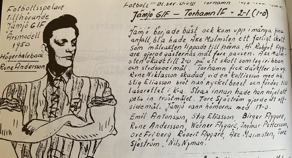 Rune Andersson var, förutom att han spelade fotboll i Jämjö GoIF och var föreningens kassör i 20 år, också en skicklig tecknare och skribent. Ofta vid Jämjö GoIF:s avslutningsfester under 1950-talet och 1960-talet tecknade han ner händelser från året som gått och satte upp dem i plakatform vid just de festerna. Runes teckningar blev på den tiden ett uppskattat inslag. För att i text läsa lite om Runes betydelse för Jämjö GoIF och för att se ett antal av hans teckningar med bifogade texter, klicka på länken Teckar-Rune Det går också bra att gå in via Mer-länken på huvudsidan. Där finns inte bara texten om Rune utan också lagbilder, historiska texter, krönikor och en hel del annat.