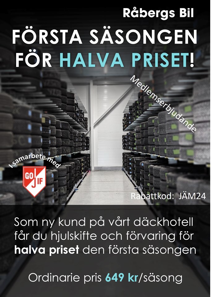 Nu får du som Jämjö GoIFare halva priset på första bytet och säsongen på Råbergs Bils däckhotell. Uppge koden: JÄM24 Råbergs Bil är en av våra största och mest trogna sponsorer.