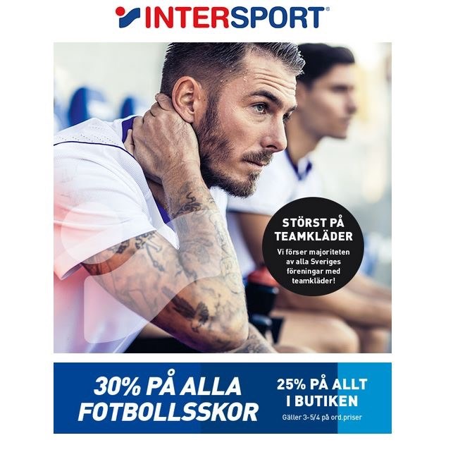 FÖRENINGSDAGAR 3–5/4 Tillsammans med INTERSPORT bjuder vi nu in dig och dina föreningskamrater till våra föreningsdagar! Som medlem i en av våra samarbetsföreningar får du 30% på alla fotbollsskor och 25% rabatt på resten av sortimentet i butiken eller på intersport.se. Ta med inbjudan till butiken eller visa upp den i din smartphone för att erhålla rabatten. Eller använd följande rabattkod: 9982017112727 på intersport.se. Välkommen till någon av våra butiker och intersport.se! Gäller 3–5/4 på ord.priser men ej på cykel, presentkort, profilkläder och beställningsvaror. A-laget 29 mar 2018