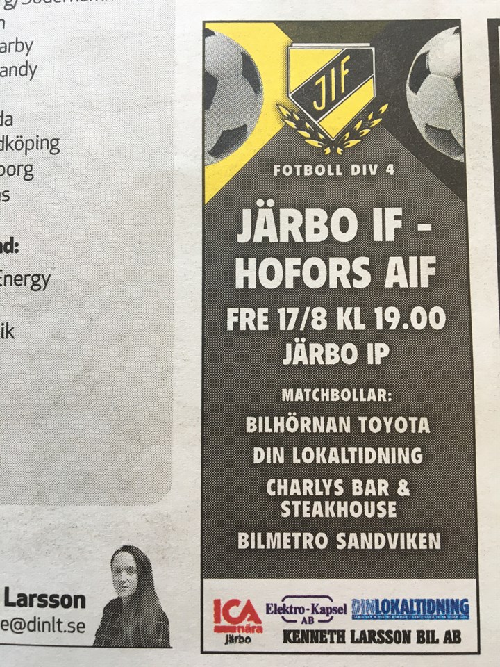 I gårdagens match mellan Järbo IF - Stensätra IF så var då Bilmetro AB i Sandviken Matchvärd och delade då ut pris till matchens lirare i båda lagen som då fick ett presentkort på en weekend med valfri volkswagen + en full tank bensin av Bilmetro AB i Sandviken ! Matchens lirare i lagen blev: Andreas Leljeval Järbo IF Peter Broman Stensätra IF Gårdagens matchbollar var skänkta av: Sandviken Hus AB Skans Golv & Vägg Charlys Bar & Steakhouse Gästrike Bilvård Dahlöfs Byggservice Ny match för våra lirare väntar redan nu på fredag den 17/8 mot Hofors AIF Hemma på Järbo IP ! /Sigge Sagge A-laget 15 aug 2018