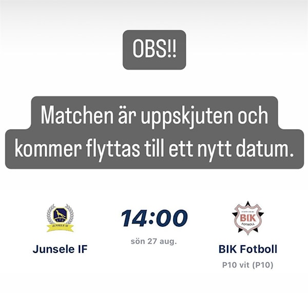 Dagens match för P09-11 mot Bondsjöhöjden IK hemma på Kebbe, som skulle inträffat 14.00 idag har blivit uppskjuten och kommer flyttas till ett nytt datum efter kontakt med motståndarlaget.