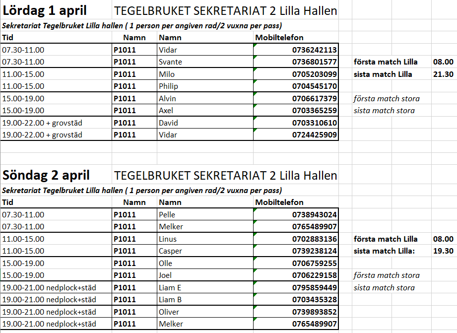 Nästa helg är det dags för Örebrocupen. Vi spelar i två olika klasser med två lag för att nivåanpassa denna cup. Vi deltar i klassen födda 10/11 samt klassen födda 11/12. Tyvärr har det varit några återbud inför cupen så vi klarar oss precis, men vi ska se om vi inte kan fylla på laget i 11/12-klassen med några spelare, vi återkommer om detta. Alla spelare har fått kallelse till respektive match de ska spela. Truppen i 10/11-klassen: Axel, Alvin, Casper, Holger, Joel, Liam B, Melker, Milo, Nellie, Oliver, Olle, Pelle, Teo, William Spelar alla sina gruppspelsmatcher på lördag 1/4 med start 0730, 1030, 1415, 1630. Alla gruppspelsmatcher spelas i Norrbyhallen Beroende på placering i gruppen blir det slutspel eller placeringsmatcher under söndagen. Spelschema på Örebrocupens hemsida ser ni här. Truppen i 11/12-klassen: David, Liam E, Linus, Oscar, Philip, Svante, Vidar Spelar sina gruppmatcher med start följande tider: fre 1730, lör 1700 & 2000 samt sön 0800 & 1315. Fredagens match i Tullängsskolan, övriga i Tegelbrukets lilla hall. Spelschema på Örebrocupens hemsida ser ni här. I denna klass spelas det 4v4+mv vilket är ovanligt för oss, men som passar ändå med tanke på antalet spelare vi har. FÖRENINGSJOBB PÅ ÖREBROCUPEN Utöver detta ska vi även arbeta på cupen, och arbetet är förlagt i Tegelbrukets lilla hall där vi ska sköta sekretariatet (samt städ lördag och söndag kväll). Jobbschemat ser ni på bilden i nyheten. Matcherna som spelas här kommer vara resultatlösa så det handlar till största delen om att sköta klockan. Ni får veta exakt vad som förväntas när ni kommer på plats. Vi har några platser på söndag kväll att fylla, så vi ledare valde att fylla upp de tomma platserna. Om någon förälder vill ställa upp och jobba istället för oss så får man gärna göra det eftersom vi ledare har fullt upp med att coacha lagen under helgen. Eller om 2-3 till ställer upp under söndag kväll så går det fort att städa och plocka undan och komma hem. Eventuella byten mellan föräldrar får ni lösa själva i kommentarfältet.