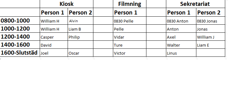 Här kommer då lite info inför lördagen. Tyvärr har det dragit ut på tiden då jag dels haft lite tidsbrist men även att det kommit lite sena (oklara) besked gällande vilka klasser som ska spelas under lördagen. Det skulle spelas 3 klasser under dagen men blir nu bara 2 klasser. Totalt spelas det 11 matcher under dagen och 9 lag kommer vara i hallen under dagen. Förutsättningarna tävlingsmässigt för vårt lag är att vår klass har 6 deltagande lag fördelat i två grupper. Plats 1 och 2 i respektive grupp möts i två semifinaler på lördagen. Vinnarna av dessa semifinaler spelar sedan finalen under finalhelgen 4-5 februari. Vi spelar minst 2 matcher under lördagen, ev 3 matcher om vi går till semifinal. Första matchen startar 0900 och sista matchen startar 16.30. Förhoppningsvis är vi klara med allting senast 18.00 på lördagen, men troligtvis tidigare än detta. Vi behöver hjälp med bakning av er föräldrar och vi har bestämt att vi ska baka totalt 6 ugnsplåtar (ca 30*40cm) fördelat på 3 kärleksmums och 3 sylviakaka. Man skär sedan bitar om 5*5 cm. Kommentera nedan hur vad du vill/kan baka och hur mycket. Utöver det behöver vi hjälp med att få tag i följande saker som vi inte kunde låna av KFUM: -Pumptermos -Kaffekokare (om någon har extra, annars kan jag ta med vår hemifrån) -Behållare med tappkran (vi ska sälja saft som blivit över från kick-offen med barnen) Malin (Teo) och Hanna (Walter) kommer handla till kiosken. Utöver detta så ser ni även arbetsschemat under lördagen. Jag la dubbla pass på er som skrev vilken tid ni kunde jobba, hoppas det känns okej, annars får ni hojta till. Men på så sätt går schemat ihop sïg precis. Sen finns vi ledare tillgängliga i hallen också under dagen, så vi kan hjälpa till i händelse av att det kör ihop sig, även om vi har fokus på laget och våra matcher. Eventuella byten osv får ni lösa i kommentarerna.