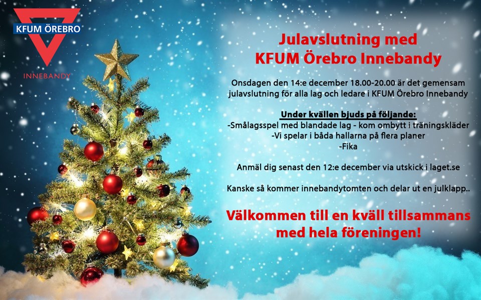 Föreningen hälsar er välkomna på en gemensam julavslutning för samtliga lag onsdagen den 14:e december klockan 18.00-20.00 i Tegelbruket. Alla föreningens spelare är inbjudna att delta där vi kommer spela innebandy på småplaner med mixade lag. Det bjuds även på fika till alla som deltar och har vi tur så kanske jultomten kikar förbi... Ordinarie träning denna onsdag utgår därmed. Svara på kallelsen som ni fått så vi vet hur många som kommer.