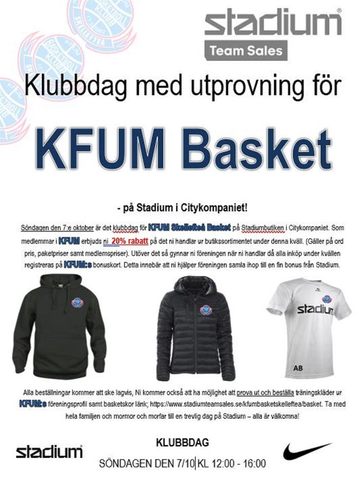 Söndagen den 7:e oktober är det klubbdag för KFUM Skellefteå Basket på Stadiumbutiken i Citykompaniet. Som medlemmar i KFUM erbjuds ni 20% rabatt på det ni handlar ur butikssortimentet under denna kväll. (Gäller på ord pris, paketpriser samt medlemspriser). Utöver det så gynnar ni föreningen när ni handlar då alla inköp under kvällen registreras på KFUM:s bonuskort. Detta innebär att ni hjälper föreningen samla ihop till en fin bonus från Stadium. Säg till i kassan att ni är från basketen, så får ni 20%. Alla beställningar kommer att läggas lagvis, Ni kommer också att ha möjlighet att prova ut och beställa träningskläder ur KFUM:s föreningsprofil samt basketskor länk; https://www.stadiumteamsales.se/kfumbasketskelleftea/basket. Ta med hela familjen och mormor och morfar till en trevlig dag på Stadium – alla är välkomna! KLUBBDAG SÖNDAGEN DEN 7/10 KL 12:00 - 16:00 Se bilden ovan i bättre kvalitet KFUM Basket Skellefteå 4 sep 2018 1kommentar