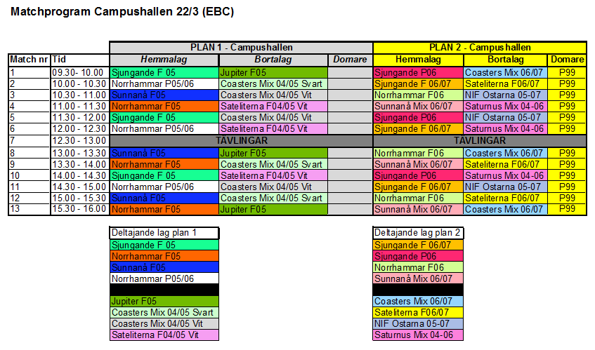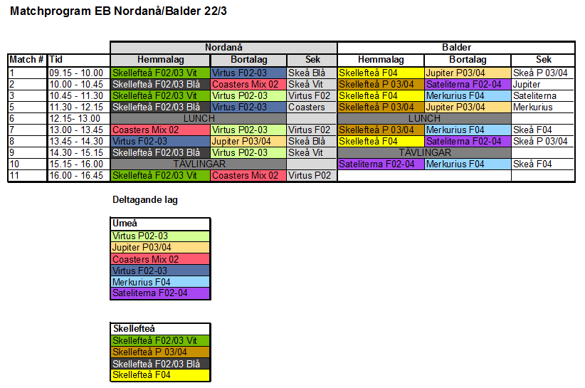 Den 22 mars spelas det ungdomsmatcher med tillresta lag från Umeå med omnejd. Matcherna spelas i totalt tre hallar: Campushallen, Nordanåhallen samt Balder. Här följer spelschema för Nordanåhallen samt Balder. KFUM Basket Skellefteå 19 mar 2015 0kommentarer