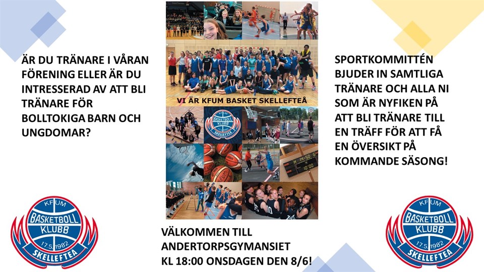 Sportkommitten bjuder in till till träff nu på onsdag kl 18:00. Nya som gamla tränare är välkommen och vi hoppas kunna få en klar översikt om läget inför säsongen 22/23! Träffen är på Anderstorpsgymnasiet och kommer att hålla på i ca 1t. KFUM Basket Skellefteå 6 jun 2022 2kommentarer