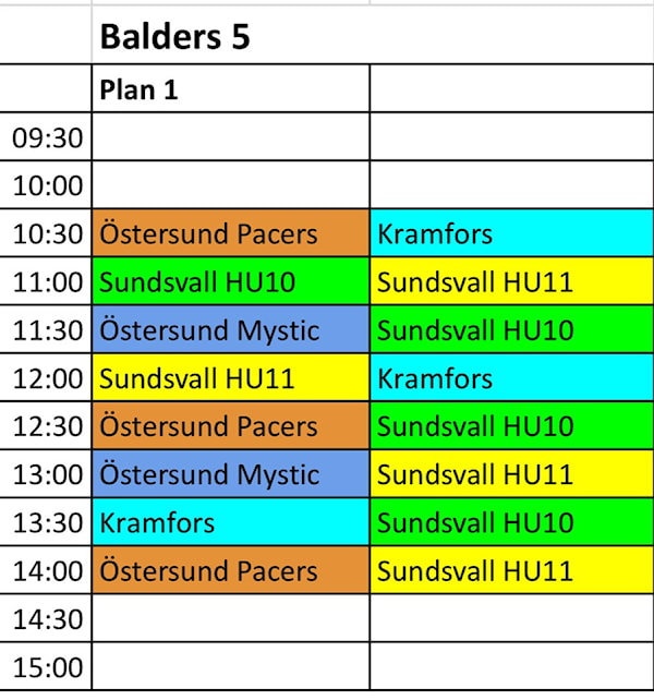 Nu är schemat klart. Se bifogad fil. Samling 45 min innan matchstart. Glöm inte att ta med matchställ. Det blir 4 matcher och en lång dag för killarna så de kommer behöva extra hjälp med återhämtning/mat mellan matcher för att det ska bli en rolig cup.