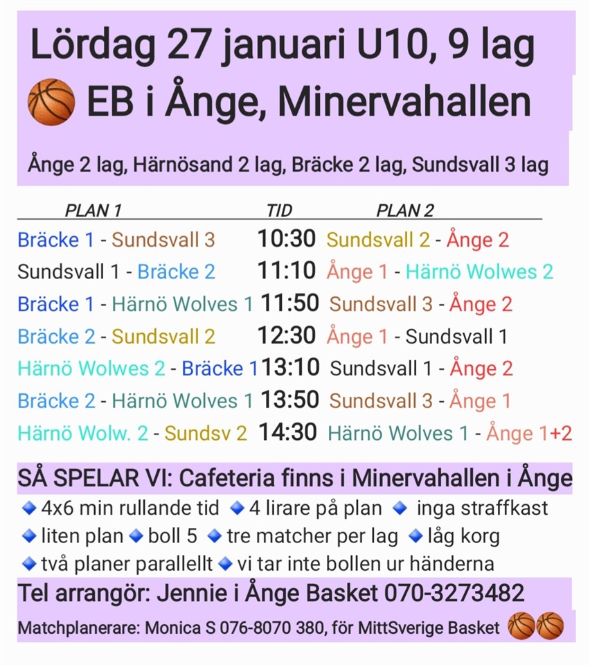 Hej! Dags för matcher nu på lördag 27/1 för er som anmält sig för spel. Samling kl 10:00 i minervahallen I Ånge Adress Västra Skolgatan 6 841 33 Ånge Ta med er era Linnen och mörka shorts Alla kommer spela tre matcher under dagen. Bifogar spelschemat med tider för matcher och annan info. Lag indelning sker på plats. Meddela om ert barn blir sjuk och inte kan delat så vi kan kolla med reserv eller göra om lagen Hälsningar Adam och Eddie